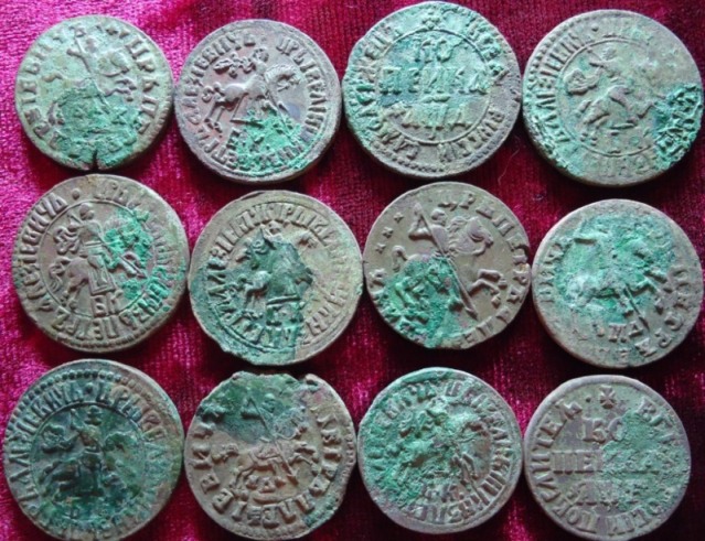 В общем, клад нашёлся совершенно случайно. В очередной день копа, я с двумя местными товарищами отправился ну бум в одну жилую деревню. Сначала начали «бомбить» большой луг внизу деревни, где за два часа друзья нашли всего три монеты а я ничего. Мне попадались только гильзы времён ВОВ. Друзья уже начали тянуть меня в другую деревню, так как эта была очень замусорена. Но у меня есть принцип на копе, если приехал на какое-то место, то уезжать с него надо, хоть с одной монетой. Поэтому предложил друзьям пробить ещё один луг, после чего начали его отрабатывать. Через пол часа, друзья ничего не найдя ушли в другое место, а я продолжал долбить намеченный участок. Через какое-то время, увидел трёх местных алкашей, которые плелись в центр деревни. Я двинулся наперерез к ним, что бы добыть информацию о деревне. Подошёл и начал расспрашивать, где раньше что было. Через минут десять подошли друзья и вступили в диалог. Как только алкаши ушли, мы включили приборы и начали расходиться в разные стороны. Мне кажется, я и шага не успел сделать, как под ногами услышал монетный сигнал. Выкапываю, и вижу копейку Петра…. Просто офигеваю от состояния монеты и зову друзей. Они возвращаются, облизываются, и мы опять начинаем расходиться в разные стороны. И тут один из друзей, в трёх метрах от найденной мной монеты откапывает слипшиеся две копейки Петра…. Что дальше происходило я не помню))))))))) Все пришли в себя, когда было уже темно) В первый день я нашёл 36 копеек Петра а мои друзья 28 и 17 копеек. Прежде чем копать на второй день, я сходил к хозяйке этой лужайки, и договорился о проведении раскопок, так как на этом месте пасли скот. И только после этого начали копать. Только я начал копать уже с помощниками))) Желающих в деревне покапать за 1000 рублей в день было очень много)))) Нарезал участок на полоски и начали шурфить. На второй день я накопал 10 монет .На третий день 20 монет.Всё это время я очень надеялся откопать ядро клада, а ещё очень надеялся что найду Петровское серебро, хотя бы рубль))) Но на третий день шурфления я нашёл не ядро клада, а место откуда все монеты распахивались. Это место оказалось туалетом….)))))Так что не зря говорят, что в старых туалетах можно всегда что то найти))) В самом туалете я углубился ещё на штык, но сигналов глубже не было. Ядра клада как такового не было, просто в самом туалете был эпицентр находок. Где удалось откопать на третий день ещё 30 с лишним монет.На четвертый день шурфления я уже занимался зачисткой участка по периметру. Шурфили до тех пор, пока монеты не кончились. Последний день принес последние 14 копеек. На этом и закончился клад. Сопутных монет вообще не было. Керамики набрал целый пакет разных цветов. В самом эпицентре были остатки белого кувшина, я их собрал отдельно. Попробую собрать сосуд, в котором были все эти монеты. Хотя возможно все монеты были в мешочке, так как ни на одном куске найденной керамики не было следов кладовой зелени. Вложенные эскизы изображений -------------------- Куплю железнодорожные пряжки с орлами.