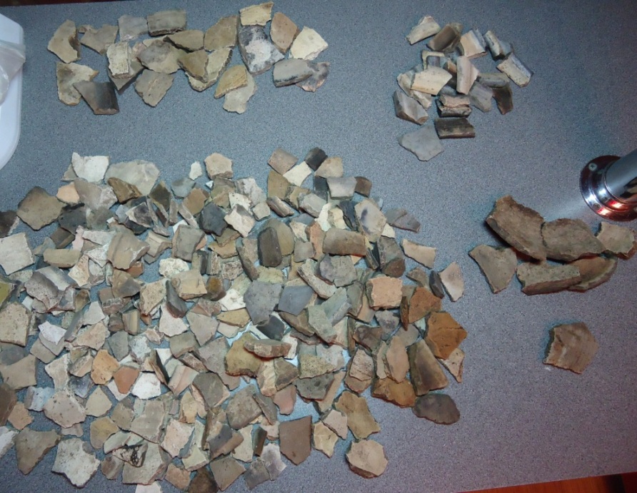 Сегодня попытался разобрать битые черепки, которые попадались при шурфлении. Хотел сделать анализ, и соотнести собранный материал к кладу. Пришёл к выводу, что данные черепки, как минимум от 10 разных глиняных посудин. Остатки монетной зелени обнаружились только на одном фрагменте, донышке кувшина. Что доказывает что монеты хранились всё таки в кувшине, и были распаханы полностью в недавнее время.