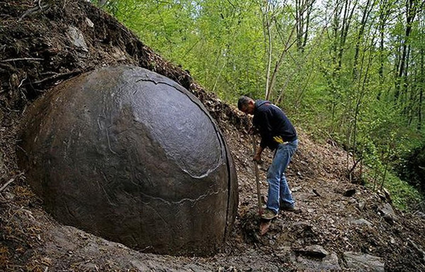 Круглый камень похож на тровант, т.е. "живой" или "растущий" камень, это природное явление.
