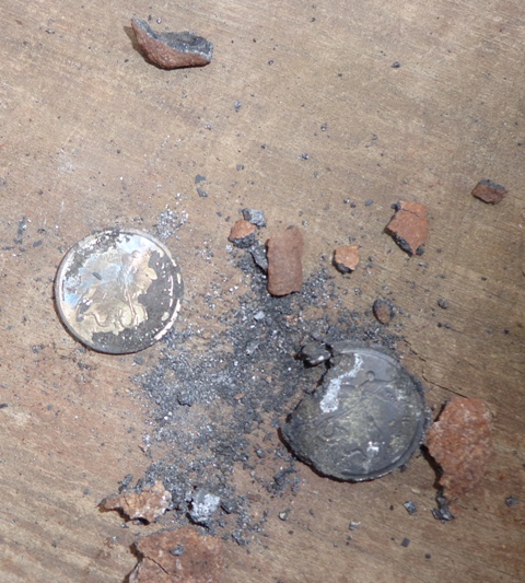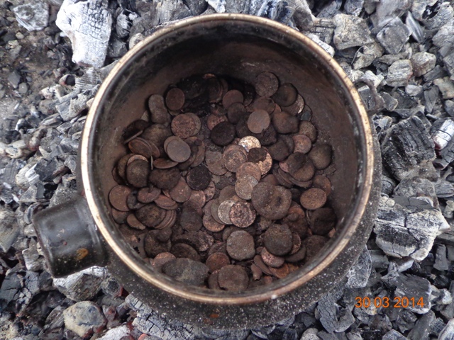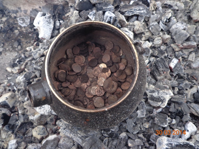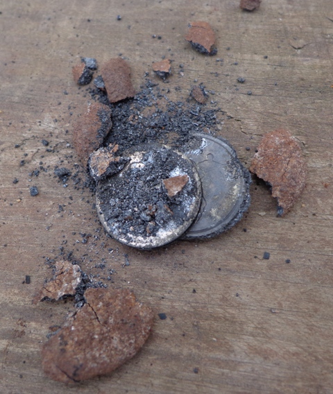 Тут на днях попались на глаза окаменевшие монеты, которые накопал виброй в Египте. Решил почистиь так сказать огнем. Положил их в старый чайник и поставил в мангал с углями. Прокалившись окаменелость стала трескаться и отваливаться, затем раскалённые на углях монеты высыпал в воду. Окаменеласть вся отвалилась.