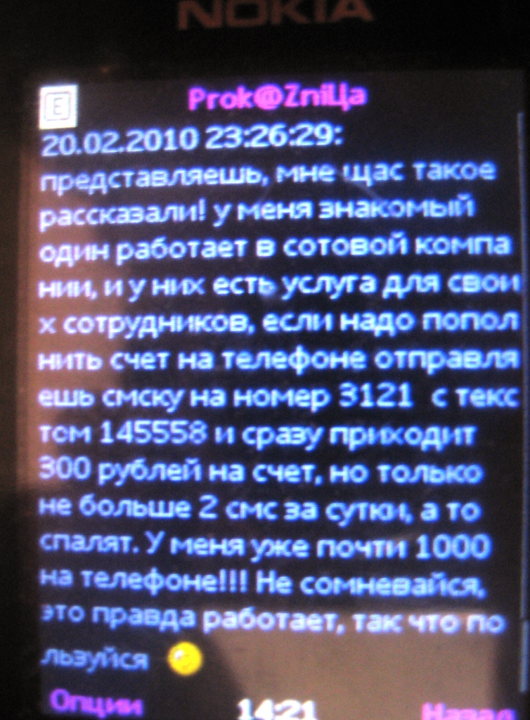 - мама скинь мне пожалуйста на такой то номер 500 рублев,телефон потеряла, все объясню позже...... Хотел сообщение ментам слить, а потом передумал.....не охото было с ними лишний раз связываться.....а на эту херню старики чаще всего и ведуться........таким бы умникам ручонки бы пообламать..... |