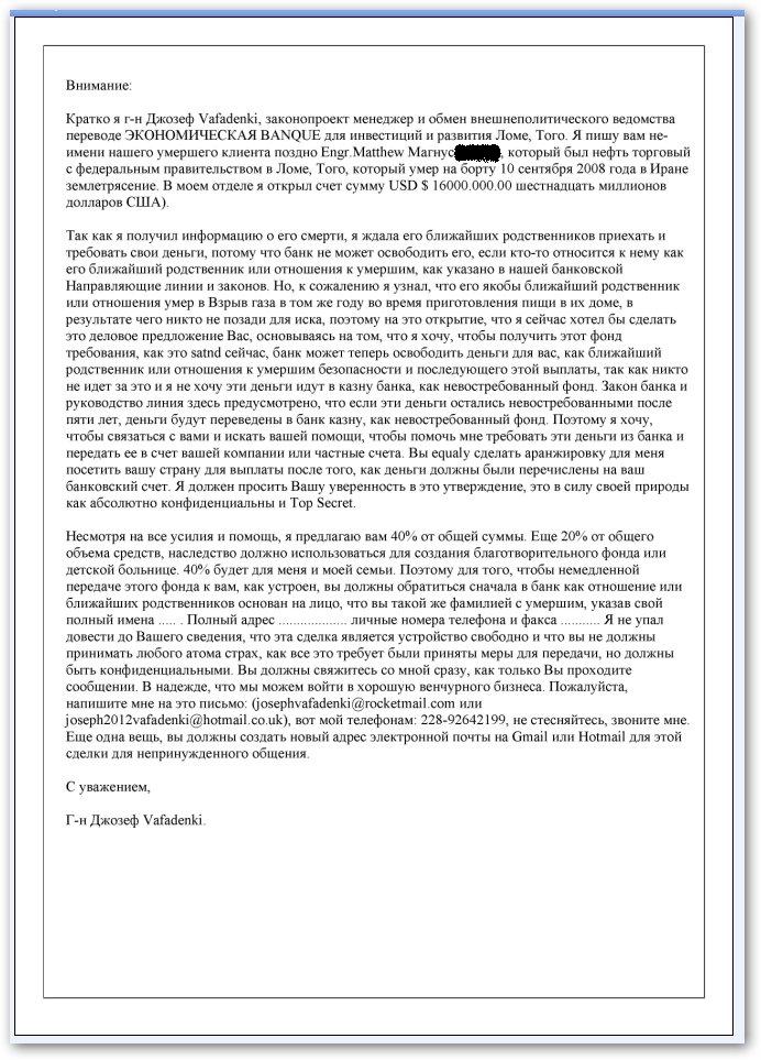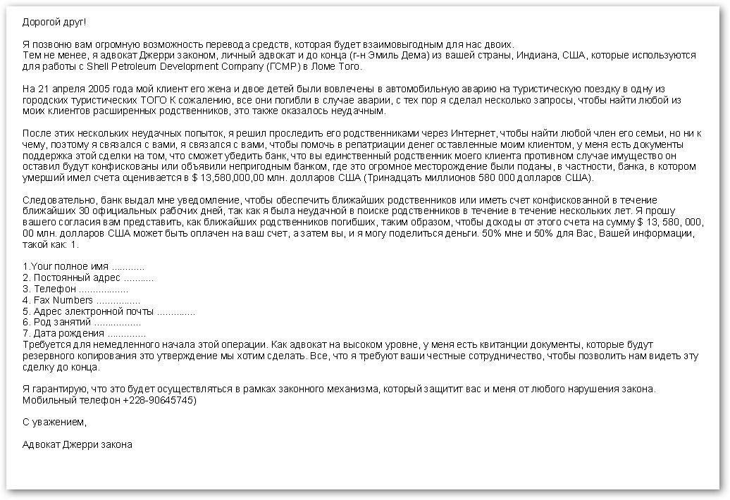 откуда всё началось Материал из Википедии — свободной энциклопедии Нигери́йские пи́сьма — распространённый вид мошенничества, получивший наибольшее развитие с появлением массовых рассылок по электронной почте (спама). Письма названы так потому, что особое распространение этот вид мошенничества получил в Нигерии, причём ещё до распространения Интернета, когда такие письма распространялись по обычной почте. Однако нигерийские письма приходят и из других африканских стран, а также из городов с большой нигерийской диаспорой (Лондон, Амстердам, Мадрид, Дубай). Рассылка писем началась в середине 1980-х гг. В 2005-м году нигерийским спамерам была присуждена антинобелевская (шнобелевская) премия по литературе. Как правило, мошенники просят у получателя письма помощи во многомиллионных денежных операциях, обещая солидные проценты с сумм. Если получатель согласится участвовать, у него постепенно выманиваются крупные суммы денег якобы на оформление сделок, уплату сборов, взятки чиновникам, а потом и штрафы.Содержание [убрать] 1 Описание мошенничества 2 Некоторые варианты 3 Пример письма 4 Юмор 5 Примечания 6 Ссылки [править] Описание мошенничества Сюжеты мошенничества достаточно разнообразны. Наиболее часто письма отправляются от имени бывшего короля, президента, высокопоставленного чиновника или миллионера с просьбой о помощи в банковских операциях, связанных с переводом денег из Нигерии или другой страны за границу, получением наследства и т. п., якобы облагаемых большим налогом или затруднённых по причине преследований в родной стране. Нигерийские письма отправлялись, в частности, и от имени личного секретаря Ходорковского. Другой распространённый вариант — письма, якобы, от работника банка или от чиновника, узнавшего о недавней смерти очень богатого человека «с такой же фамилией», как у получателя письма, с предложением оказать помощь в получении денег с банковского счёта этого человека. Речь в письмах обычно идёт о суммах в миллионы долларов, и получателю обещается немалый процент с сумм — иногда до 40 %. Мошенничество профессионально организовано: у мошенников есть офисы, работающий факс, собственные сайты, часто мошенники связаны с правительственными организациями, и попытка получателя письма провести самостоятельное расследование не обнаруживает противоречий в легенде. Если получатель письма отвечает мошенникам, ему посылают несколько документов. При этом используются подлинные печати и бланки крупных фирм и правительственных организаций. Нередко в аферах участвовали реальные правительственные или банковские чиновники Нигерии. Затем у жертвы просят деньги на сборы, постепенно увеличивая суммы сборов для обналичивания, или на взятки должностным лицам, или могут, например, потребовать положить 100 тысяч долларов в нигерийский банк, мотивируя от имени сотрудников банка, что иначе перевод денег запрещён. В некоторых вариантах жертве предлагают поехать полулегально в Нигерию якобы для тайной встречи с высокопоставленным чиновником (без визы), там он похищается или попадает под арест за незаконное прибытие в страну и у него вымогаются деньги за освобождение. В худших вариантах он может быть даже жестоко убит[1]. Часто в ходе вымогательства мошенники используют психологическое давление, уверяя, что нигерийская сто