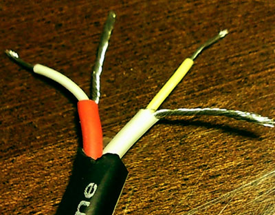 Вверху на фото кабель. Представляет собой два проводка в изоляции. Поверх этой изоляции идет экран из медных, тонких проводков, он так же покрыт изоляцией. Получается два проводка и два экрана. Экран играет роль сигнального провода. И получается , что катушка подключена четырьмя проводами.