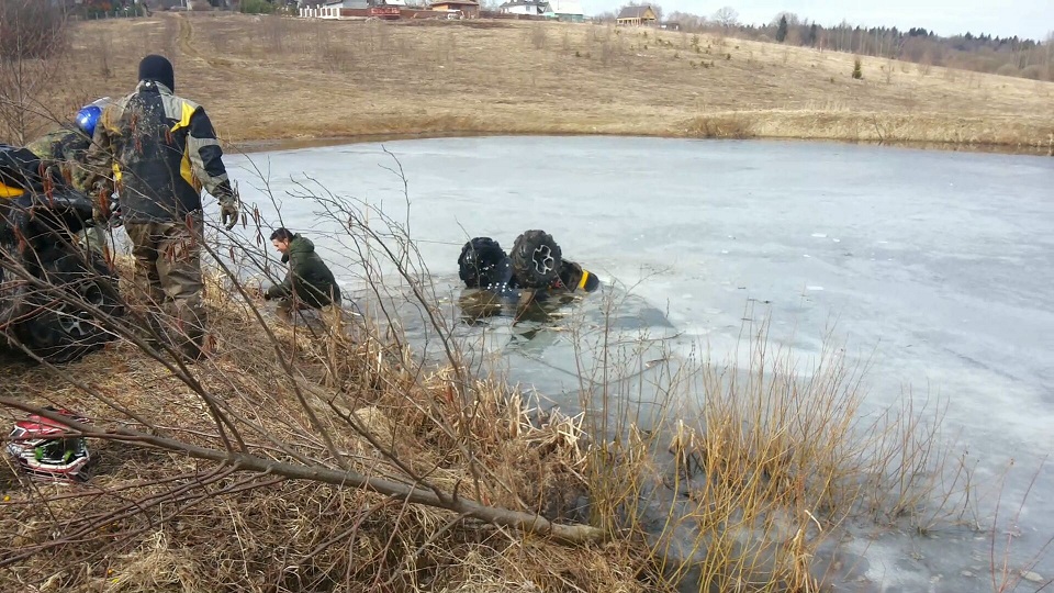 что то подобное и мы прошлой весн7ой учудили литровый брп ушол на дно только была весна лёд ещё был и был прыжок парень думал что просто горка а там пруд квадр вытянули но недосчитались айфона и навигатора но в воду за ними уже не полезли
