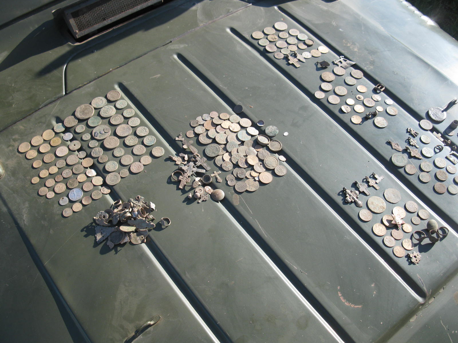 QUOTE(org @ Jun 10 2011, 10:36) Ваше право Но, поверьте, частота - роли не играет (100% проверено) Что 18, что 7, что 4 кГц - глубина обнаружения одинакова, ну может разница в 1-1,5 см (вы ее не заметите). Не та разница в частоте, что бы сигнал по разному затухал в грунте. А насчет грунта ... Может где то и есть такой грунт, но я его пока в своей области, и окружающих тоже, не встречал. полностью согласен ,вот фото с выезда,тут и е-трек и терки 705 и вайсы.верхняя левая кучка накопана хр,там от чешуи Петра до 5 коп Екатерины,плюс куча крестиков и пуговок. такой же результат у е-трака,но у меня штатная катушка. так что все он прекрастно видит,отличный прибор! блок ношу на поясе,с вайсами мне обзавидывались,у них руки к вечеру отваливаются,а мне все похрену Вложенные эскизы изображений -------------------- Мы, вятские - хватские: с пола не падаем.