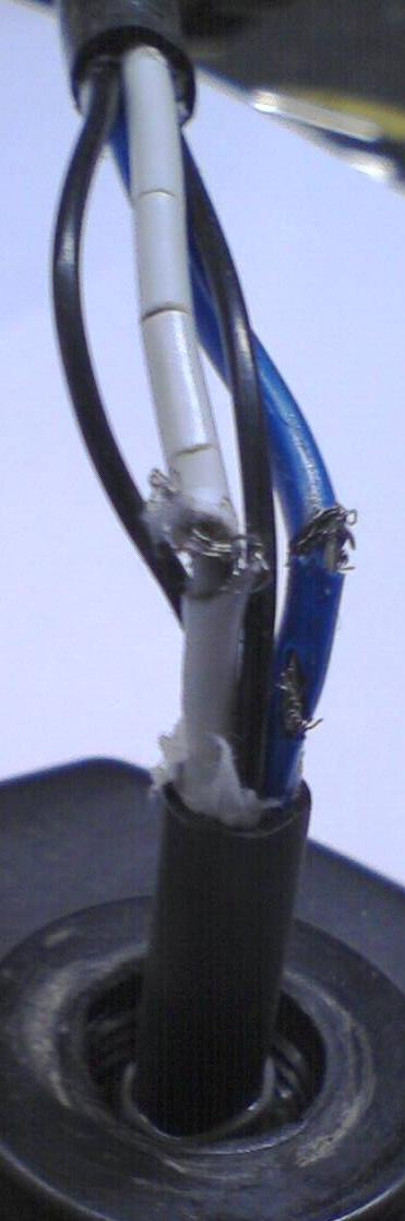 В 90% процентах при отказе катушки, проблемы возникают из-за обрыва кабеля около разьема. Разьём опрессован. Поэтому приходится "курочить". (Тут сразу добрым словом вспоминаешь разбираемые разьёмы.) Но сделать можно всё было бы желание. На фото разборка и устранение поломки. :arrow: Синий провод -приёмная катушка-, белый провод -генератор-Хорошо видны перетёртые провода.Зачищаем, перепаеваем, прежде надев термоусадочную трубку. Всё. |