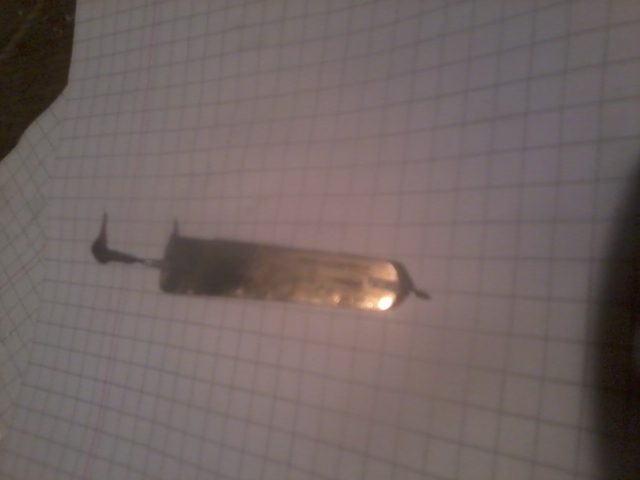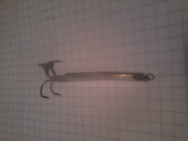 а вот и сама блесна..обещал...длина 50мм ,ширина-в хвосте 11мм,где петелька- 7мм .толщина-1.5мм .вся ровная без округлостей.материал-серебро плюс латунь.при падении издает мелкую частую дрожь.но самый лучший материал это колокол-бледно розовый.у нас когда-то лет 70 назад упал и разбился -все рыбаки растащили по кускам..Блесна чуть изогнута и с внутренней стороны на крюке нитка красная.сначала спаиваются две половинки потом пропилы и пайка крюков и петли.