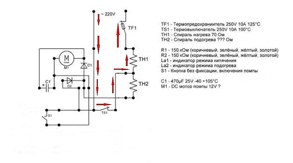 QUOTE(Мотоциклист @ Mar 16 2023, 00:14) Стою на асфальте я В лыжи обутый То ли лыжи не едут То ли я е.......й Короче,термопот перестал подавать воду.Помпа не помпа.Разобрал,подал на моторчик 12 вольт - идеально качает.Померил обмотки.Нагревательная в норме,поддержание температуры в обрыве.А именно через нее питается моторчик.Разобрал не разборный ( не для советского человека) ТЭН. Восстановил контакт - все работает.Но тут очевидное-невероятное началось.Наливаю кружку воды,отпускаю кнопку.Хочу налить вторую - мотор молчит.Проходит 5 минут - опять можно налить 1 кружку. Никакой автоматики там нет.Что происходит? Олег рад приветствовать! Здравствуй! Крайние выводы нагревателей не перепутал случайно? Проверь также термопредохранители, чистоту контактов. Окислы и подгоревшие контакты термопредохранителей могут провоцировать термо отключение этих предохранителей. Правда могут быть закрытые термо предохранители, тогда только замена неисправного. За 5 минут эти предохранители остывают и схема снова может работать, до следующего срабатывания термопредохранителей. Возможно этим предохранителям наступает кирдык и пора их менять из за изменения температуры срабатывания. Проверь, какой термо срабатывает на отключение. Мультиметр на 220 вольт параллельно термо, градусник/термометр в воду на сколько возможно ближе к каждому из термо. Заодно проверишь температуру срабатывания термо. Явно, что отключение моторчика по температуре происходит. Отредактирую: Выше написанное - не сразу разобрался в схеме. Что и для чего служит. Отвлекают домашние делишки разные. Выше написанное удалять не стал. Читай что ниже написано: Ещё одно, и наверное это более вероятно! И скорее всего это так. Пока TS1 замкнут, моторчик не включится. То есть, вода не подогрета до рабочей температуры. TS1 блокирует включение моторчика. Вообще блокирует цепь моторчика и спираль подогрева ТН2. При размыкании TS1 начинает работать цепь моторчика и спираль подогреваТН2. А по схеме, TS1 на 100 градусов рассчитан. Пока вода не догрета до температуры срабатывания TS1, дальше не получишь работу моторчика и спирали подогрева ТН2. Сообщение отредактировано Ohotnik_mur: Mar 16 2023, 11:40 -------------------- Мои МД и пин: X-Terra 705, Garrett ATX, Сфинкс 02