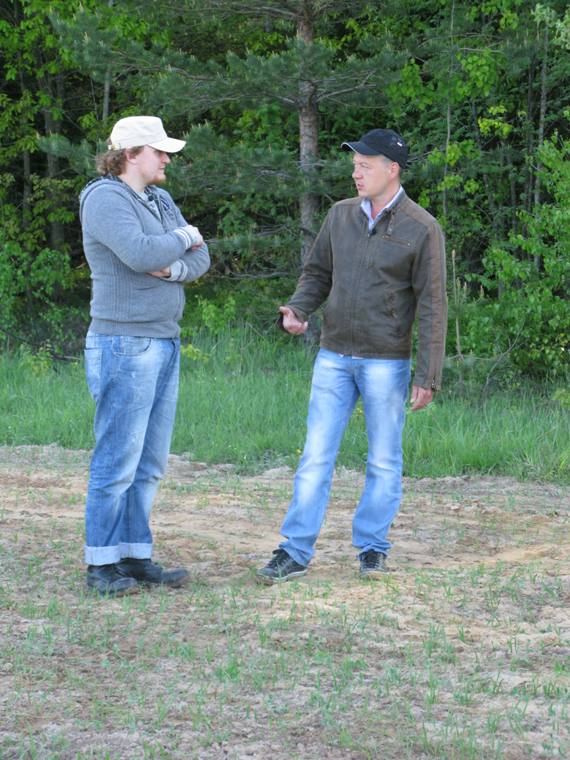 Мы уже чертили сапогами дорожный песок по направлению к урочищу. Мне было предложено просто идти вперед и рассказывать, словно я на рядовой прогулке со своей дамой, не обращая внимания на мельтешащих вокруг операторов, а главное, не смотреть в камеру. Операторы, в свою очередь, то забегали вперед, то отставали, приседали, вставали на колени, норовя поймать объективом мой взгляд. Девушки то и дело переспрашивали, не стесняясь, влезали в саму сердцевину проблемы, если надо было, вгрызались резцами острых вопросов. В который раз я как испорченная грампластинка рассказывал наседающим папарацци про село, про стоявшую тут когда-то церковь, про нелепую череду природных катаклизмов. Все слушали с таким серьезным видом, почти удрученным, что иногда, едва сдерживаясь, ронял я уголком рта мимолетную улыбку, она соскальзывала с губ и тут же пропадала, после чего лицо снова обретало официальный вид. Не доходя урочища, я остановился и показал группе в сторону, где в 18 веке располагался погост. Погост проплывал слева от нас поганеньким подобием вырубки, на которой уже несколько лет колосился малинник вперемешку с прочей лесной дребеденью. Снимали, шли дальше. На поляне я позволил себе копнуть. Лопата со скрежетом выгрызла круг и, подцепив, опрокинула вверх ногами. На поверхность травы посыпались вместе с серым песком осколки колотых крынок, ржавь, показался и огрызок красивой, даже по современным меркам глазурованной тарелки. Гости, словно в музее, рассматривали с любопытством находки, вертели в руках, кто-то догадался понюхать: «Фу, как воняет, гарью какой-то или еще чем». Сбросили все назад, закопали. Дальнейший путь вел в густеющий полумрак плотносплетенного ельника и по нему, петляя и обходя завалы, вышли к тому самому месту, где в беспорядке натыкал я палок с нанизанными на них обрывками целлофанового пакета. Палки, как и прежде, стояли на своих местах, россыпь оранжевых огоньков маячила тут и там, внося в дремучую дрему леса, что-то чуждое, потустороннее. Вокруг клубились комары. Соседство с заболоченным ручьем вносило свои нотки в лесную действительность, комары, завидев нас, липли, отгоняемые руками спереди, заходили с тылу и опять липли. Отмахиваясь от насекомых, гости недоуменно оглядывали веселящие глаз всполохи ядовито-оранжевой краски, вопросительно воззрились в мою сторону. Я, силясь подобрать нужные слова, пытался объяснить редакторам смысл этого брутального дизайнерского решения окружающего пространства: - Эти метки моих рук дело, это я их тут напихал. Думаю, это как-то можно использовать в съемках. Не успел еще закончить мысль, как меня перебила Ольга: - И как, по-вашему, мы сможем использовать эти палки? - Вы меня не поняли. Палками я пометил находки, они под ними, под палками, - я поднял, потом снова водрузил корягу на свое место, продолжил. - Здесь мне удалось найти восемь находок. Это, наверное, последнее, что тут осталось, остальной лес весь перекопан. - А что там? - поинтересовалась Ольга, тактильно изучая водруженный рядом с ней, меченный огрызком шест. - Не знаю, я их не выкапывал пока, интриги ради, просто пометил шестами, и клоками пакета, чтобы не потерялись из виду. Озадаченная редакция, оглядываясь на импровизированную иллюминацию, зашепталась. В итоге, решено было снять полиэтиленовые украшения, оставив палки стоять в гордом один