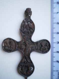 Над небольшой возвышенностью МД подал неуверенный, но высокий сигнал. Откопав сантиметров 20 лопаты стали упрямо тыркаться в старые, рыхлые кирпичи, которые с легкостью вынимались из земли и буквально рассыпались на глазах. Видимо, скромные остатки стоявшего тут строения. Сигнал не утихал, а напротив, с каждым сантиметром усиливался, лаская слух многообещающей высокой тональностью. Звук при этом лавировал из стороны в сторону, так, что пришлось раскапывать яму шириной более метра. На глубине 50 сантиметров в переплетении толстых березовых корней и остатков фундамента на радость копателей красовался хорошей сохранности мой первый в жизни «пропеллер».