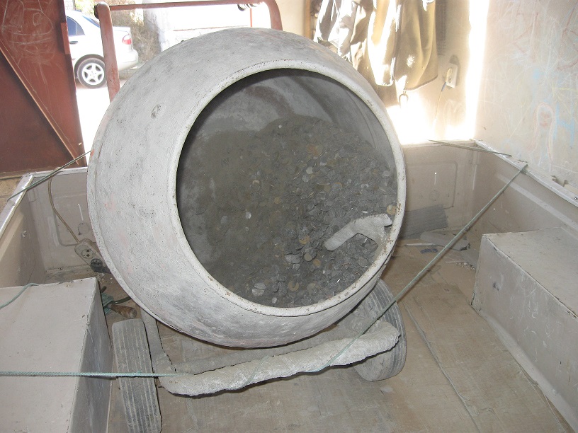 На ведро мелочи кинул ведро отсева+2 лопаты песка и 2_3 литра воды часа три крутил.