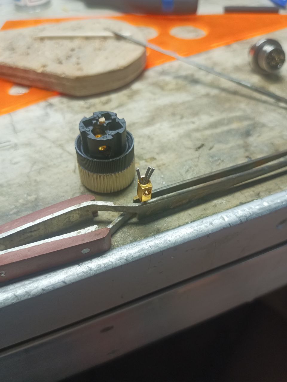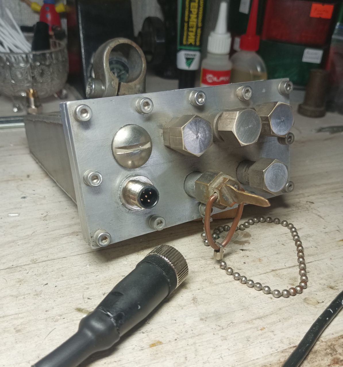 Внедрил в блок китайский разьемный коннектор Ф12, 4 пин. До этого было два выхода под гермовводами, на питание и наушники. Теперь через один кабель на тройник.