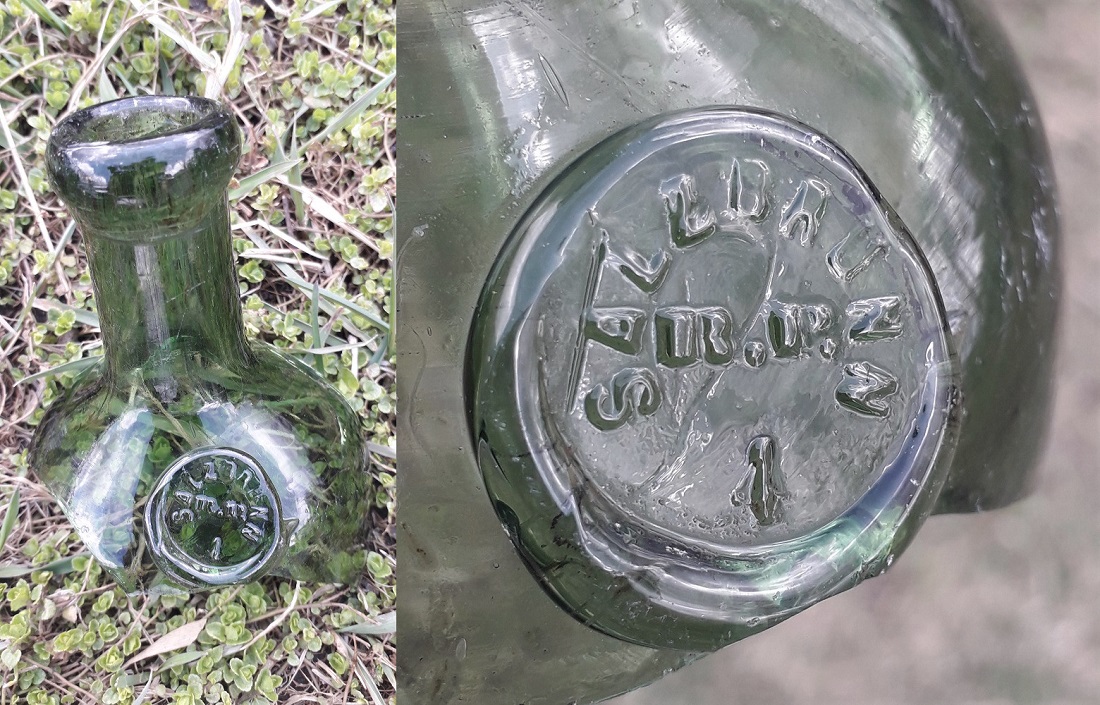 Для Андрея, с целью пополнения каталога: донце от небольшого штофа светло-голубого стекла. Надпись: буквы ОЗЕПИ, ниже год: 1869 г.