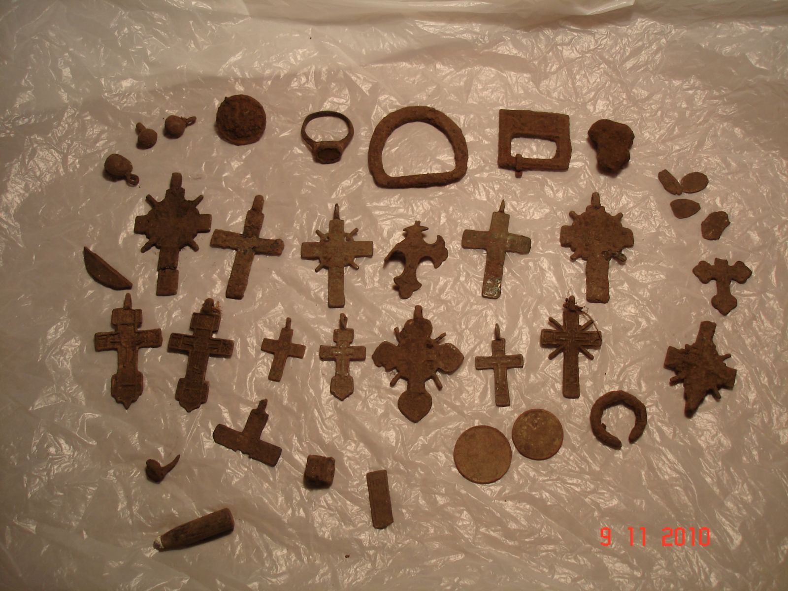 QUOTE(НикНик @ Nov 9 2010, 10:39) Джиму спасибо.Получил катушечку SEF DD 10х12,попробую завтра обкатать(если дождя небудет). Ну вот и обкатал.Только что приехал. Часа три походил.Последний раз был на этом месте с кат.9на8 штатн.,нашол кажется пару крестиков,пуг.гирьку и чешуйку.Место выбито крепко,думал там уже делать нечего. С SEF 10х12 поехал туда намеренно,посмотреть что получится. Теперь за катуху,привык почти моментально,после пары закопов центр определял уверенно,только очень тихие,глубокие цели определить потрудней чем штатной.В доказательство не цапанул ни одного креста,только один заломил наверно когда выворачивал комок земли.Сначала показалась чють тежеловата но быстро перестал замечать это.Ведет она себя нормально,разделение по металам такоеже как штатная(показалось что даже лучше).Естественно не все цели были глубокими но защет большей площади кат.искать естестно комфортней.Один крест орал я думал что там большая железяка с дыркой,видно лежал плошмя примерно на глубине 10-15см. Короче мне очень понравилось.Ещебы походил но ехать далеко,дождь пошел и надо было выехать до темноты а там километров 30 по полям. А вот собстно находки.За фотку звиняйте,даже не мыл,просто показать что накопал. Еще раз повторюсь,место выбито капитально. Вложенные эскизы изображений |