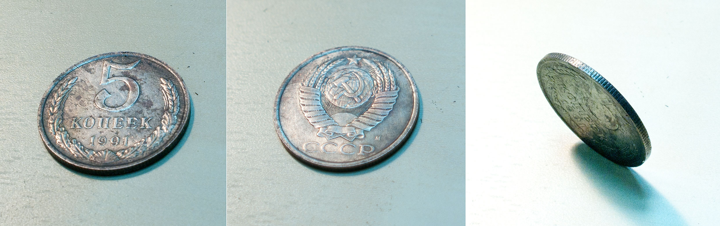 Посмотрите вот такую монетку. 5 копеек, 1991год. Но металл белый. В Конросе такую не нашел. Найдена в поле, Моск.Обл, глина. Помогите идентифицировать и оценить)) В момент находки была черной, с проблесками белого металла. После электролиза стала такой)) может я чего не так с электролизом намутил?))) Или может это пробник которого нету в каталоге?)) Сообщение отредактировано volkazirik: Aug 1 2011, 20:30 Вложенные эскизы изображений -------------------- Продаю инструмент для задабривания Земляного Дедушки :) - kalimba-hokema.ru