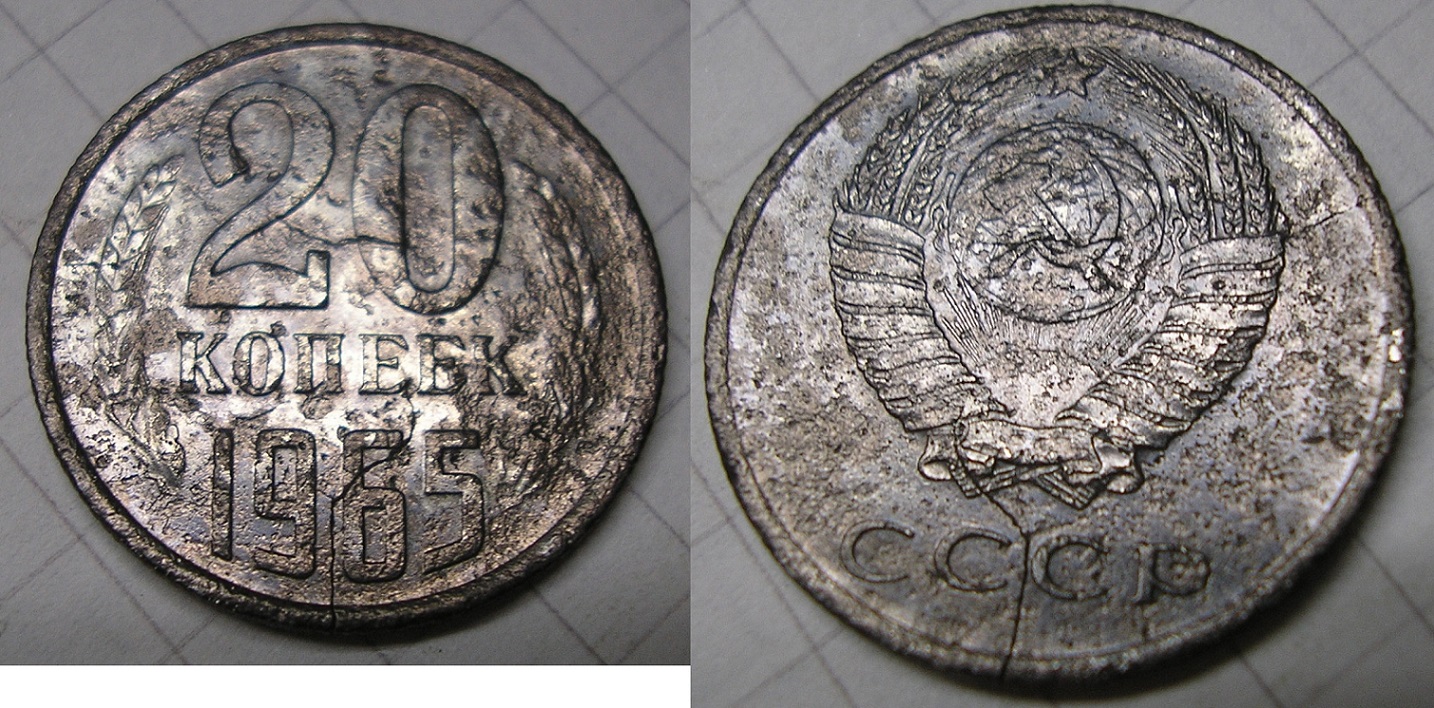 Подскажите по монетке 20 копеек 1965 года в состоянии немного измождённом, с выразительными трещинами заготовки, одна посередине в области герба, другая с краю от гурта. Сколько может стоить сей шедевр Благодарю ответивших! П.С. Монета не гнутая, без следов деформации. Сообщение отредактировано Евлампий: Apr 26 2014, 21:07 Вложенные эскизы изображений -------------------- "Не желай ни кому того, чего себе не желаешь" или "Как аукнется, так и откликнется"