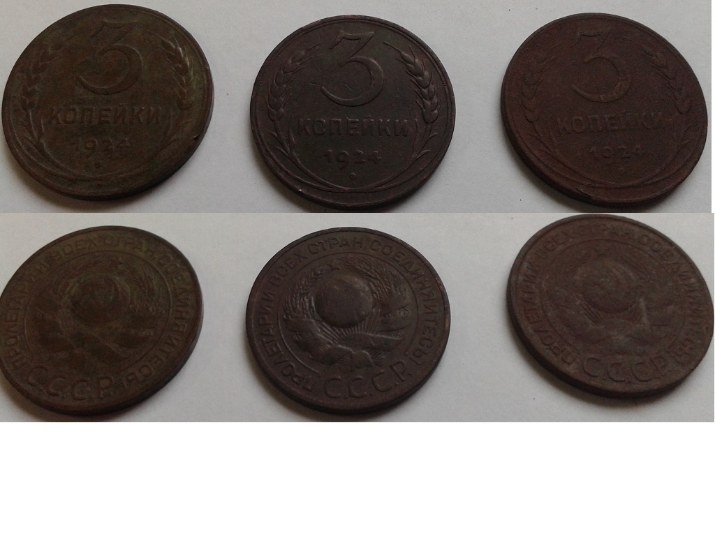 QUOTE(oas_izhevsk @ Oct 18 2014, 12:55) Здравствуйте! Оцените, пожалуйста, 3 монетки 3-х копеешные 1924 года. не !!!!не видно |
