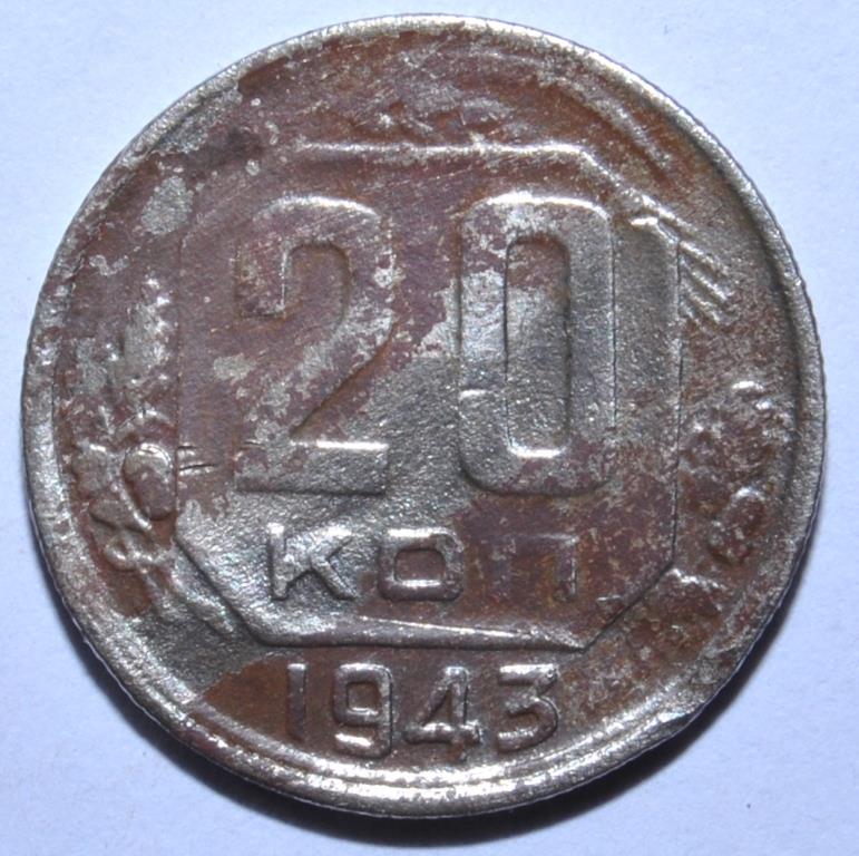 Нашел в закромах 20 копеек 1943 г. Вроде штемпель Б. В таком состоянии можно понять разновидность и сколько может стоить. Досталось монетке от жизни. Как буд то с передовой.