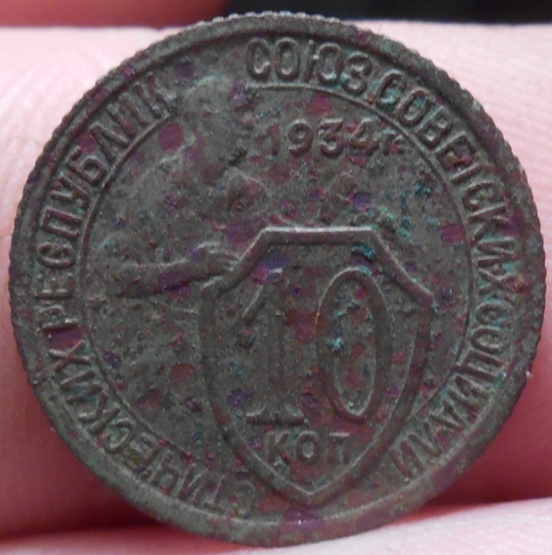 QUOTE(Leprikonov @ May 16 2016, 23:34) 10 копеек 1934 года. Подскажите по стоимости в данном сохране. вижу Шт.1.2 — меридиан подходит к рукоятке молота. сохран плоховат 50-80р |