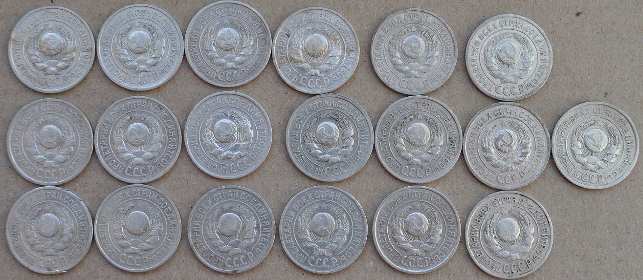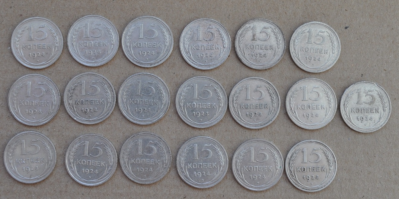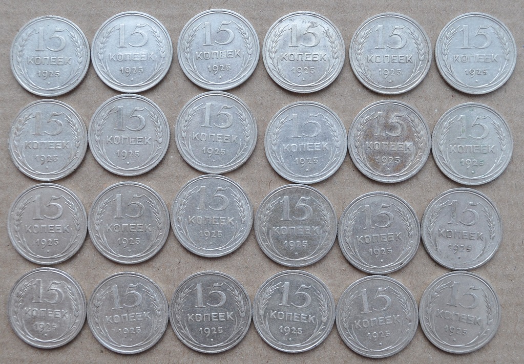 В своем предыдущем посте, я просил определить интересные разновидности по 24 году. Ошибся. Разновидности, по которым я запутался - это 25 год. Помогите, пожалуйста, определить, есть ли на фото интересные. Заранее спасибо. На самом деле 15-шек 25 года у меня, наверно, больше сотни. И еще вопрос, насколько есть спрос на разновиды? Сейчас вот лежит около 1000 штук разного билона и не пойму, есть ли смысл заморачиваться по разновидам или продать так?