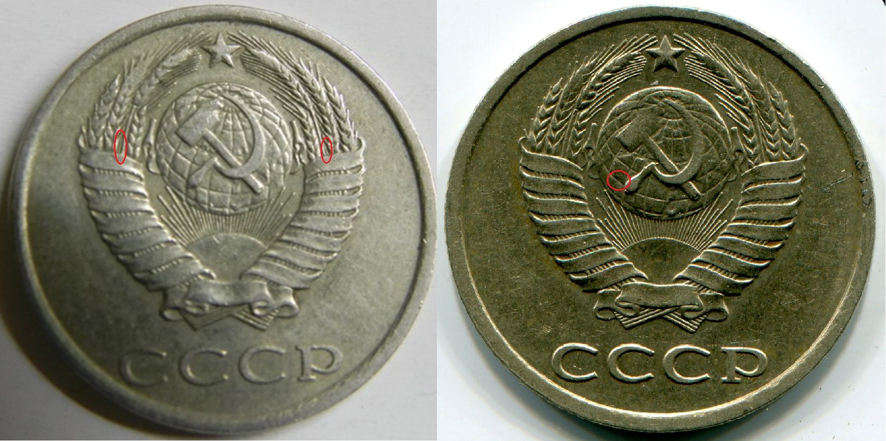 Подскажите по этим монетам год один а по металу вроде не похожи.Обе лежали в лимонке.А цвет разный.Из какого метала делались монеты этого периода?.Спасибо.