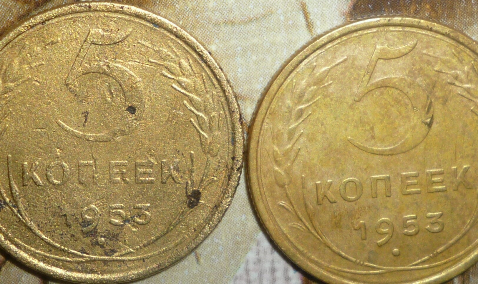 Доброго времени. Уважаемые спецы по саветам, прошу определить и высказатся по 2 монеты 5 коп 1953г, мне видится что реверс одинаковый а аверс разный. Прошу обратить внимание на ручку серпа она без полосы, и срез остей с лева они тоньше и две нижних явно короче остальных. Зарание благодарен и с уважением.фото аверса чуть позже