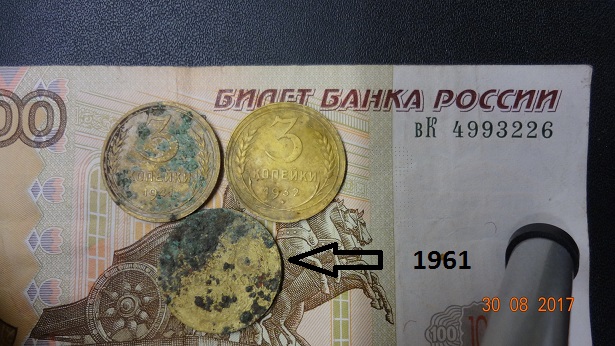Здравствуйте.На копе попалась монета 3 копейки 1961 года,цвет бронза,окислы характерны бронзе,монета не чищена,помыта водой,вес 2,74,лежала одна с другими монетами не соприкасалась,в инете информации не нашёл,что это рарик?