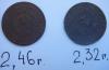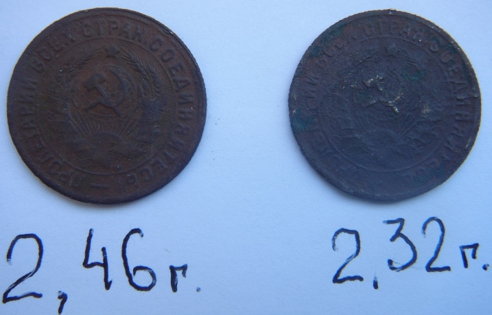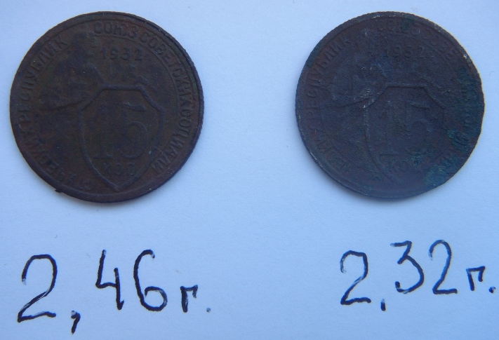 Доброго времени суток, форумчанам. Помогите разобраться. Есть две 15 копеечные монеты 1932 года. С виду одинаковые, но отличаются толщиной и по весу 1- 2,46гр., 2- 2,32гр. (на китайских весах). В описаниях есть три варианта два с отличаем в штемпеле но одинаковым весом и один (пробный), из другого металла с другим весом. Заранее благодарен за помощь.