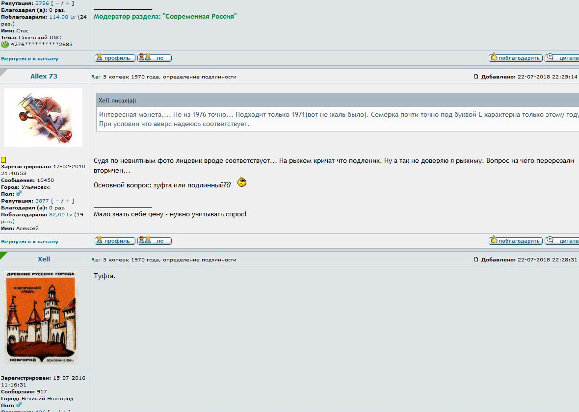 QUOTE(Kornous @ Jul 29 2018, 20:39) Мне неинтересно мнение дилетанта в разновидностях монет РСФСР-СССР, у которого знаний хватает только на то, чтобы позиционировать свой шмурдяк в продажах на соседнем типа "монета кладовая"... А с недавним определением подлинности пятачка 1970 года Вы вообще пустили классный пузырь... В лужу, разумеется... Пы.Сы. Да и с ником Вам однозначно не мешает определиться... Товарисч Павел061182... ну да после отзыва про рыжего Вложенные эскизы изображений -------------------- Куплю клады ,монеты в любом количестве оптом.