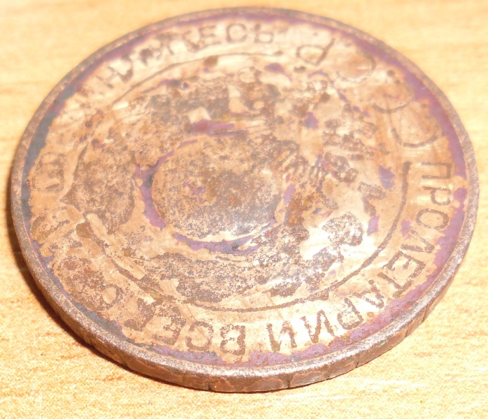 Коллеги , тут попалась такая монетка, вроде обычная чепуха, но при детальном рассмотре оказывается что надпись "Пролетарии всех стран соед.." вдавлена, все буквы и в слове ВСЕХ последней буквой видится Г. Кто что думает прокоментируйте пожалуйста, монета не моя , товарищ принёс.