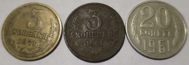 Здравствуйте! Прошу помочь с определением и оценкой 3 копеек 1961. Есть подозрение, что монета из нейзильбера. На МД у нее VDI 52, у 20 коп 1961 - 53, у 3 коп 1971 - 66. Толщина 1.3 мм (20к61 - 1.4мм, 3к71 - 1.1мм).