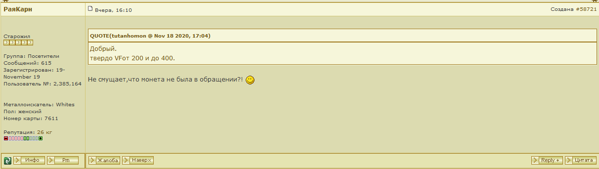 QUOTE(Kornous @ Nov 18 2020, 21:24) Вам не надоело ещё писать многабукв ниочём??? Ваша задача - выложить нормальные фото (в резкости и не засвеченные) своей монеты вместо размещённой мутотени... А потом уже будет предметный, аргументированный разговор... Пы.Сы. Лично я, по выложенным вами фото, не наблюдаю тех вкусняшек, о которых вы пишете... Долго читал это все. Я бы и 200р не дал за нее. Согласен с Вами, что нет там вкусняшек. -------------------- Куплю клады ,монеты в любом количестве оптом.