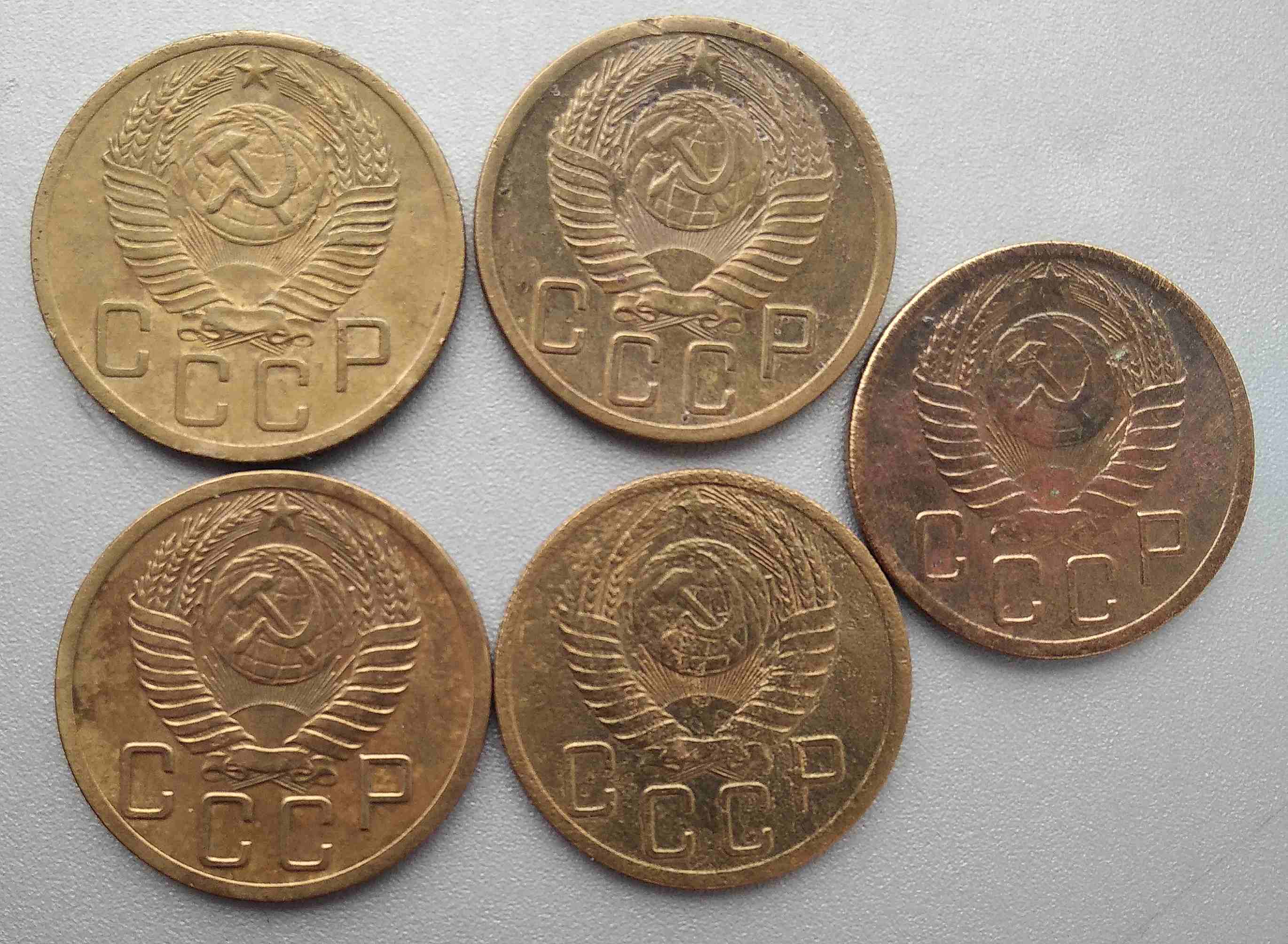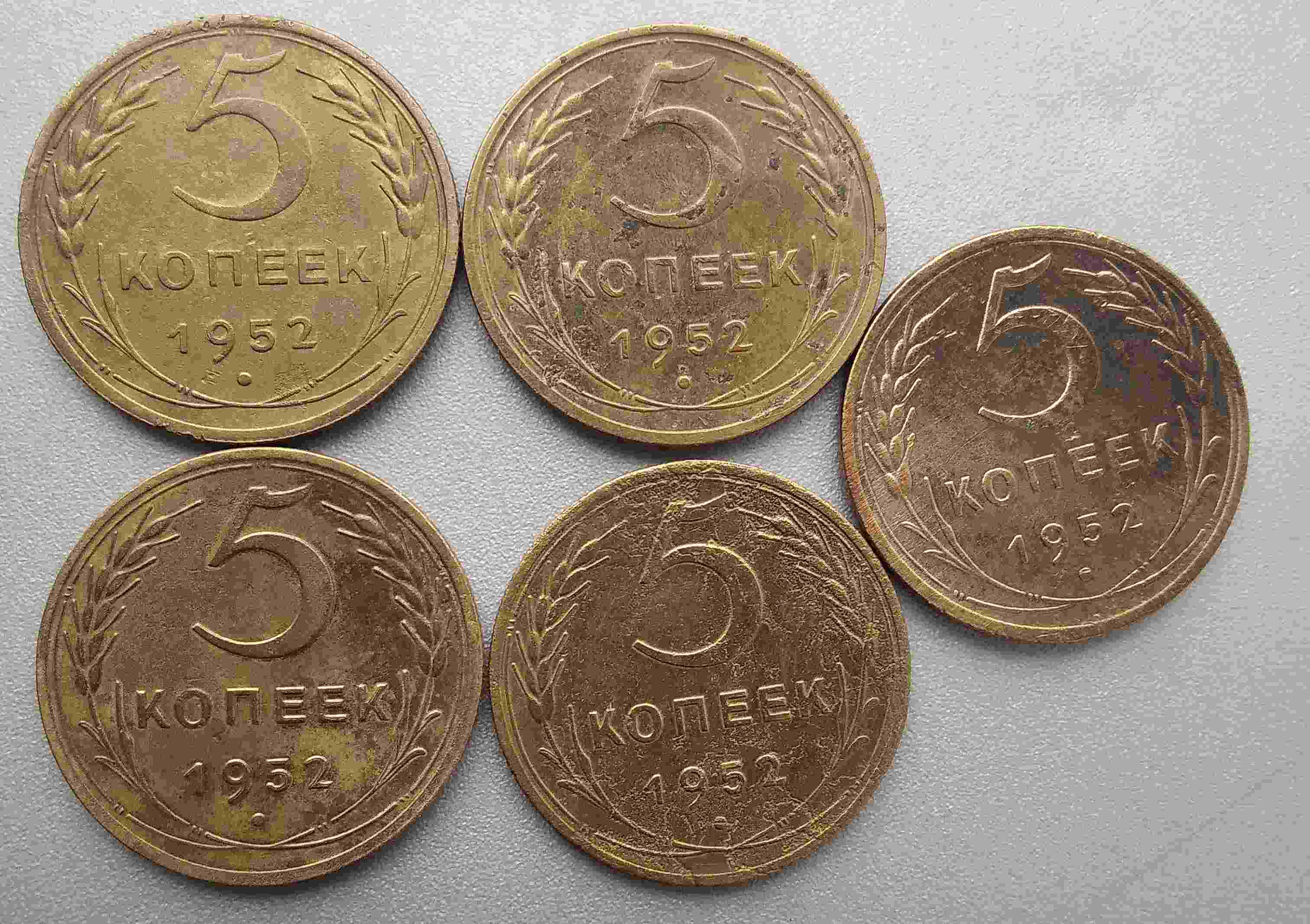 Здравствуйте,подскажите пожалуйста,есть ли интересный пятак 1952г. на фото?На левом верхнем между правых 1 и 2 лентой 8 стеблей..Заранее признателен.