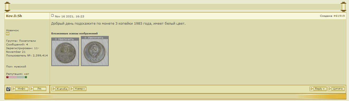 QUOTE(Мы не курим @ Nov 19 2021, 09:30) темный каштан , я не говорил что монета не интересная . Я пояснил что пользуется спросом , и что нужно сделать , что бы дать шанс заинтересовать людей вашей монеткой . Очень много зависит от состояния монеты . А его у вашей не видно . Попробуйте переделать фото , покажите свою монету . Поворот у неё не маленький . Может кого и заинтересует . Некоторые собирают "циферблат" ( вроде бы так это называется) , может им будет интерес . спасибо за развернутый ответ ! пусть валяется до лучших времён )) -------------------- sero venientibus ossa