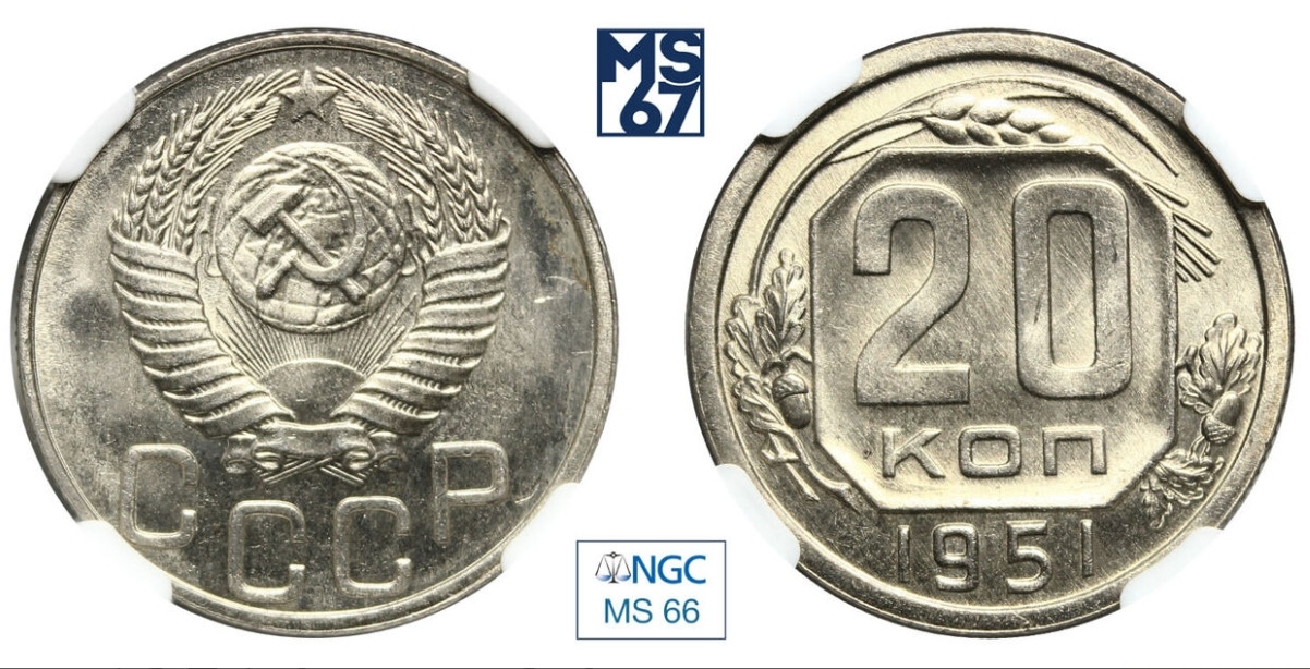 Подскажите,сколько будет примерно стоить 20к1951 в грейде ms65? Грейдил в ННР,стал счастливым обладателем данной монеты. Номер по базе KU3642. Смотрел про проходам данная монета в грейде ms66 ушла за 185т.р., ms65 не попадалась. И стоит ли сделать перегрейд в NGC? Где-то на просторах интернета читал,что ННР занижает грейд иногда. Всем спасибо
