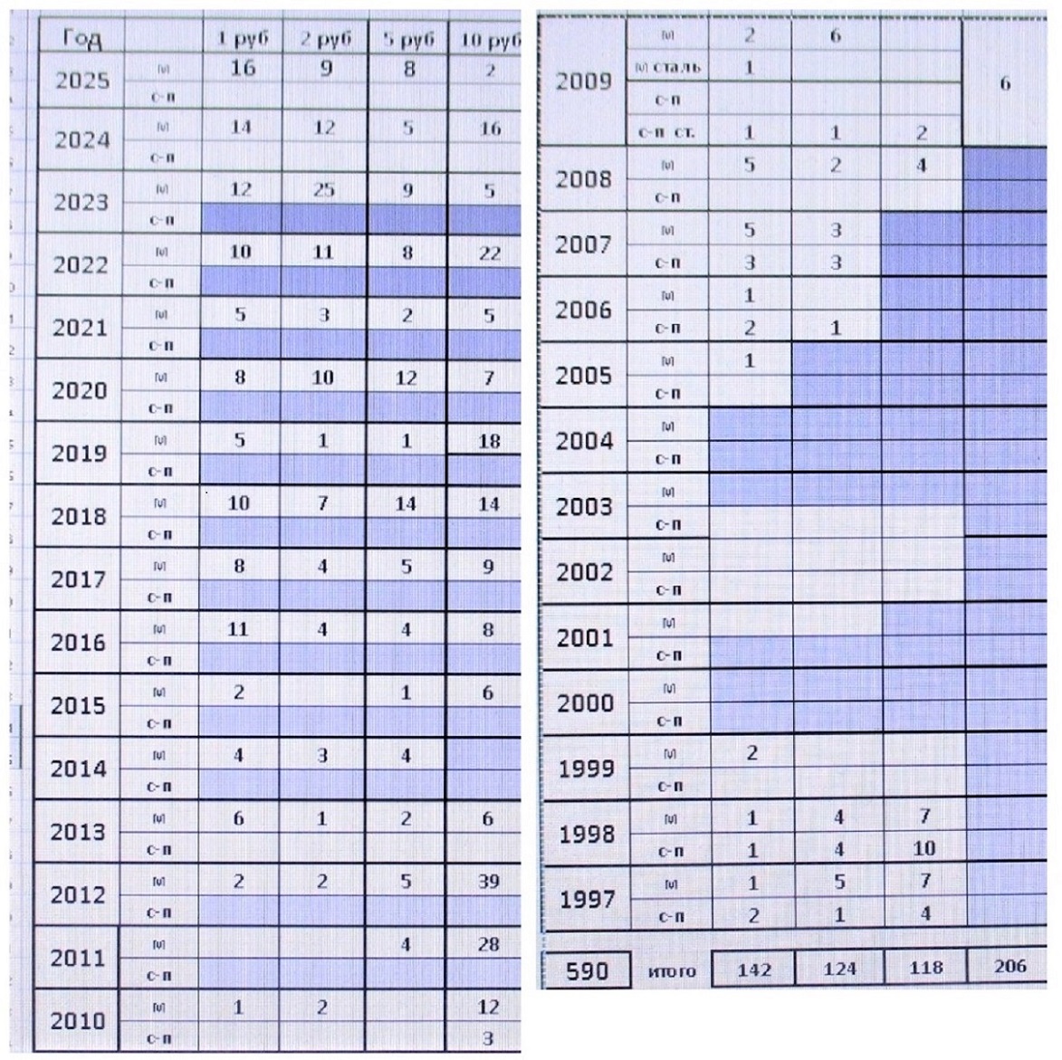Давно, лет 20 назад, я первый раз увидел таблицу погодовки СССР. Тогда мне подумалось - сейчас быстро соберу ))). Наивняк! До сих пор собираю ). А потом подумалось, а вот если бы я стал собирать погодовку в 70-х годах прошлого века?! Сейчас думаю, что и тогда бы не собрал! Здесь есть кто нибудь кто собирал погодовку СССР в те годы? Если есть, то поделился бы об успехах. А что сейчас с ходячкой? Можно ли собрать погодовку? Решил посмотреть, что можно собрать из оборота сейчас. Это итог сбора за 9 месяцев прошедшего года. Только с 1 рубля. Копеек уже нет в обороте (на сдачу не дают))). Локация - Москва, подмосковье, Рязанская обл. Каждый вывод может сделать сам. Сообщение отредактировано alexsandr-X: Вчера, 11:55 Вложенные эскизы изображений -------------------- Не важно как медленно ты идешь - пока не остановишься. /Конфуций/