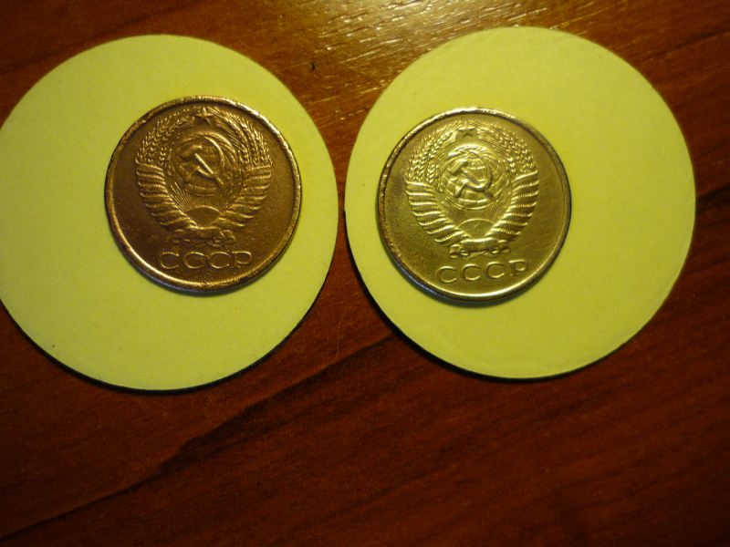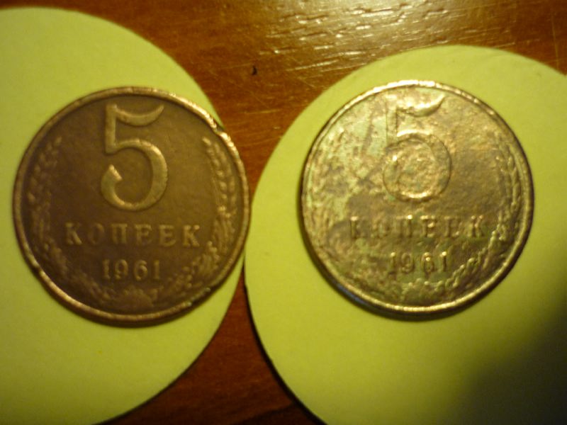 Здравствуйте , помогите разобраться с 5 копейками 1961 г монета справа ( жёлтый метал как до 1961 г )перерыл инет весь стоит хоть чего ,