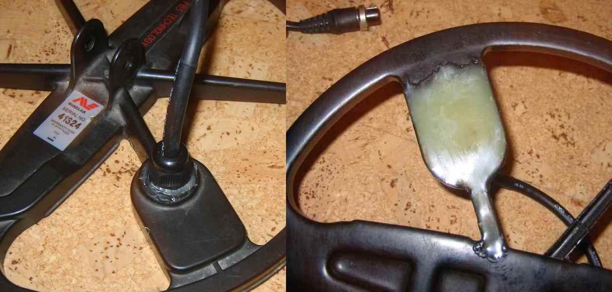 Затем, подготовленный кабель, про кабели много написано на форуме, вместе с гермовводом вставил в катуху. Для подгонки диаметроа гермоввода и посадочного места катушки пришлось вырезать подходящую по диаметрам шайбу из пластика(старый пульт от телевизора). Затем припаял провода. Сомнительные места дополнительно проложил электроизоляционным материалом, после чего проверил сачала тестером, затем подключив к прибору. После, место установки гермоввода проклеил термоклеем из пистолета.