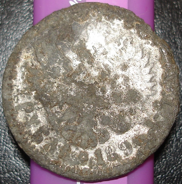 Аверс ![]() Реверс ![]() Рассказ eJ_Digger, нашедшего монету в 2005 году "Нашел в эти выходные 20-копеечник 1880 СПБ-НФ со странным дефектом (нехарактерный излом) в верхней части. Монета, казалось, обычная, как и все остальные находки, и осталась бы без внимания доживать свой век в коробке с остальными монетами. Немного отмыл от зеленых окислов. Все бы ничего, если бы монетка не упала с полки на стол и от этого излома не отлетела серебряная фольга! Посмотрел под микроскопом. В сердцевине монета слоеная как вафельный пирог, и не серебро, а медный сплав! По всей поверхности, в т.ч. на гурте видны следы меди (немного, в местах царапинок/выбоинок). Не литье, более походит на чеканку фальшивыми штемпелями, НО изображение аверса и реверса полностью соответствуют оригиналу, плюс ко всему выглядят несколько "потертыми". А вот гуртовка подкачала. Расстояние между ребрами, как и глубина насечек на гурте разнятся. Видно использовался самодельный гуртильный станок. Монета при ударе издает более глухой звук, больше похожий на алюминий, нежели на серебро (не звенит). Взвесил. Вес составил 2.8 гр. (+0.1) против 3.5 гр. у оригинала. Фальшивка! По совокупности находок и фактов можно сделать вывод, что фальшивка предназначалась для использования в денежном обращении (проще говоря, имела хождение). Похоже, что изготовлена методом гальванокопии, с последующим серебрением. И на первый (да и на второй) взгляд не возможно отличить от оригинала". (С) не нарушен. -------------------- ...всему своё время