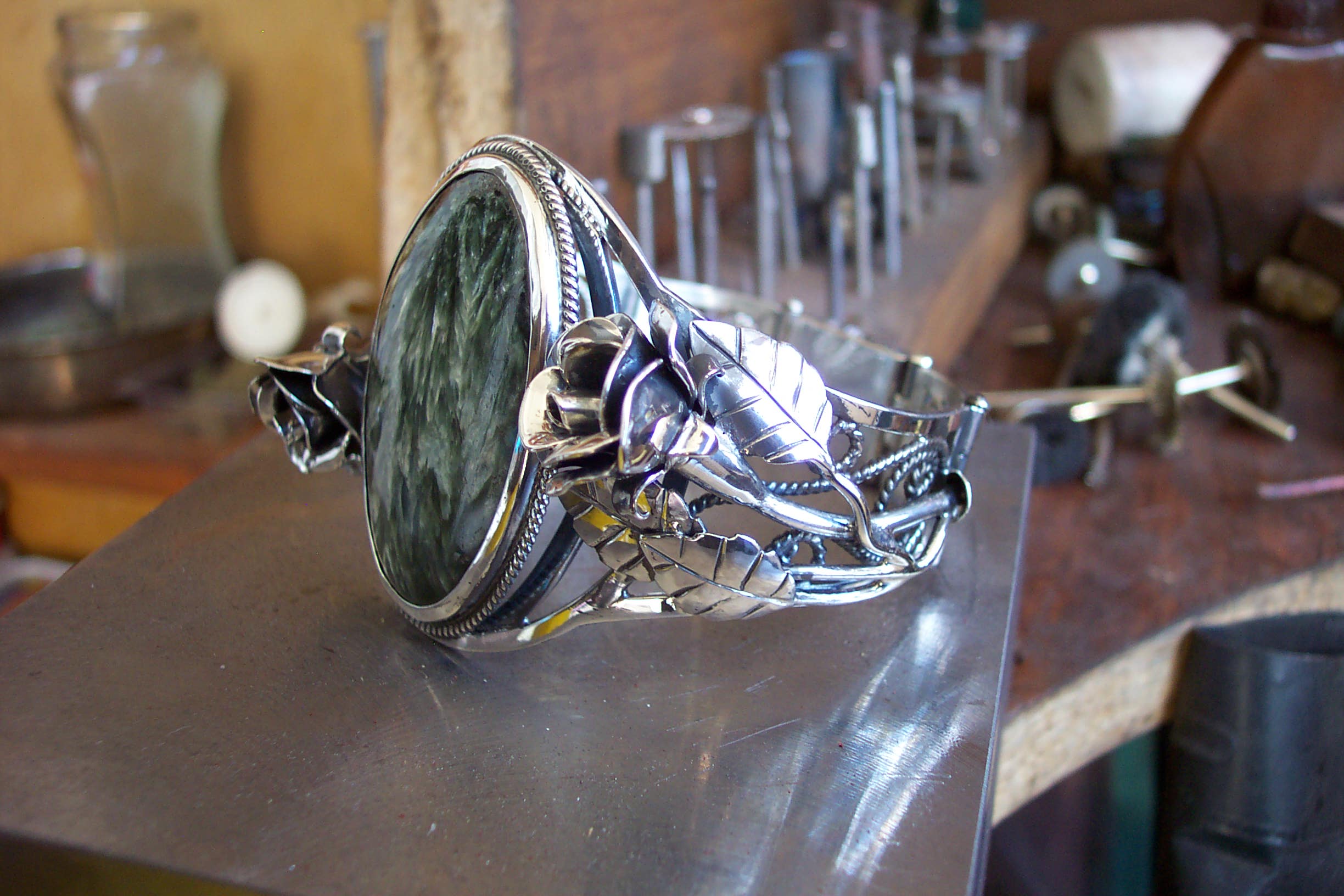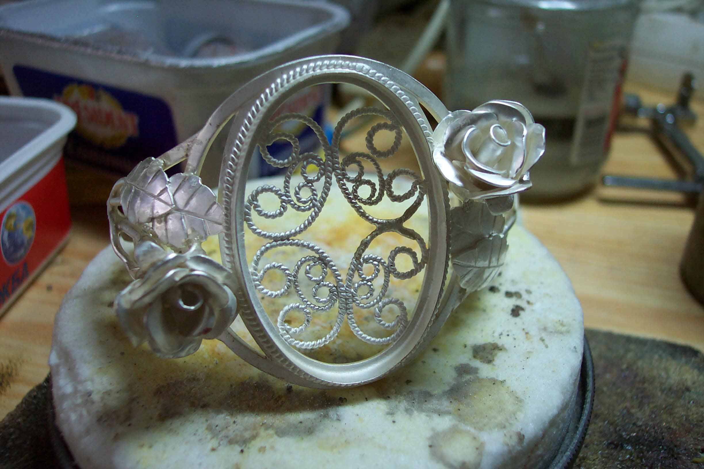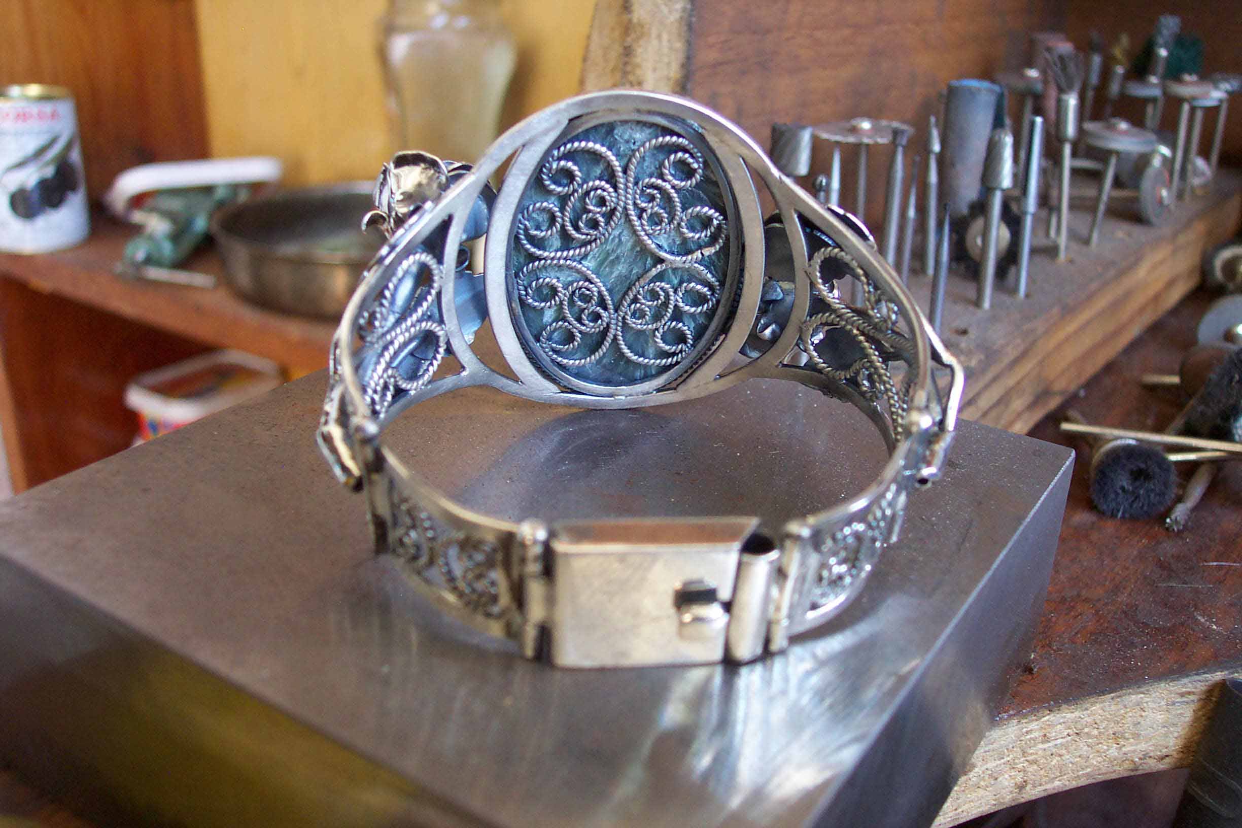 Всё делается своими руками в том числе и замки.. Любой ювелир свободно их делает.Покупалось только серебро. Изнутри скань на оправе камня для того, чтобы рука с камнем не соприкасалась. Многие дамы почемуто не любят это и просят именно так сделать. Но это по желанию вообщето.. А так ещё и для обладателя приятно. Вроде изнанка, а смотрится красиво когда снимешь..