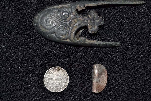 15 копеек с дыркой -печаль, билон 20 коп (год не известен) искалечен напрочь и как я понял насадка на рукоять кинжала или ножа материал похож на бронзу. (шмурдяк найденный описывать не буду) копал с 18 до 20.30 - уже не так жарко.
