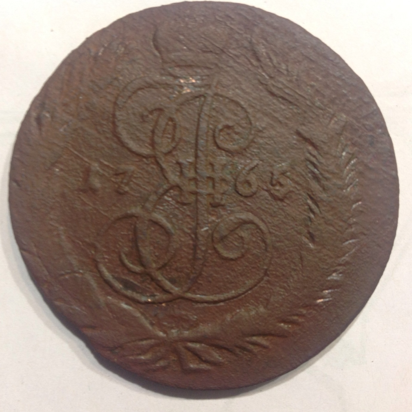 Здравствуйте ув. форумчане. Помогите пожалуйста вот с таким вопросом. В своей коллекции обнаружил 1 коп Екатерины, история долгая но вкрации что лет 40 назад была куплена в Ленинграде, потом лежала лежала и у меня всплыла. Меня смущает что она фальшивая, какая-то копеечка не такая. информации в нете не много...Посмотрел реально копаные, всё ровно что то в ней не то...Может кто то подскажет настоящая или подделка? Медный блеск это лежала с др монетами и потёрлась....