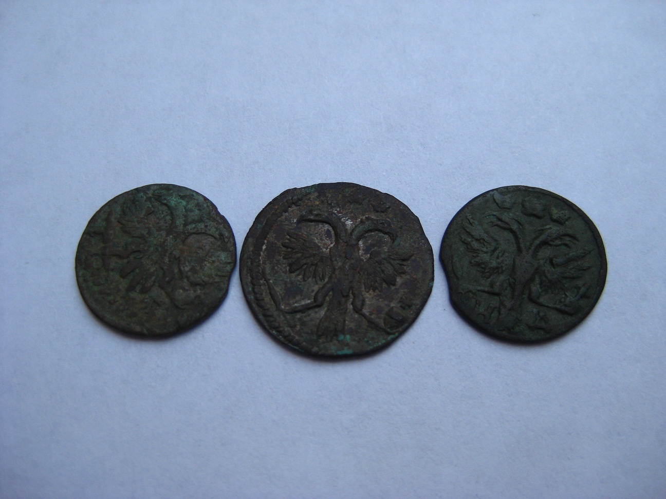 и ещё одно фото Деньга 1714 года, в круговой надписи Всея Россiи повелiтель. цена 350-450 руб. Полушки (год цифрами) 1720 года, цена 150-250 руб. полушка 1718 года, цена 250-300 руб. полушка 1720 г. Н.Д. ( год буквами) цена 250-300 руб. (ИМХО) -------------------- Если я выиграл Ваш лот,сообщите пожалуйста в личку.