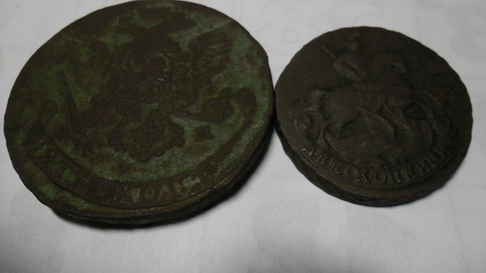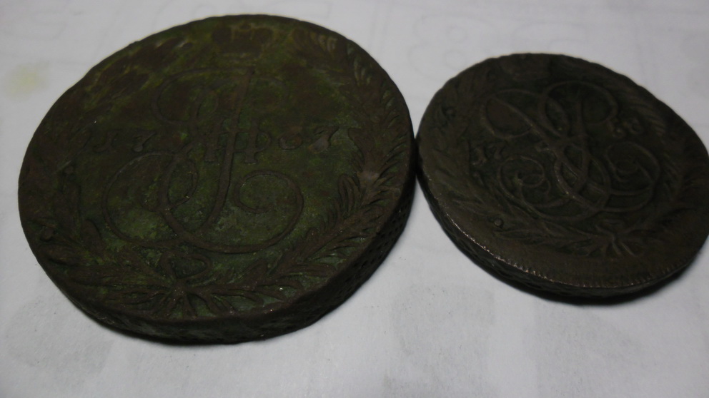 Уважаемые знатоки,прошу помощи в оценке. Пять копеек 1767 года, ЕМ, цена 150-200 руб 2 копейки 1758 года-350-500 руб. -------------------- Если я выиграл Ваш лот,сообщите пожалуйста в личку.