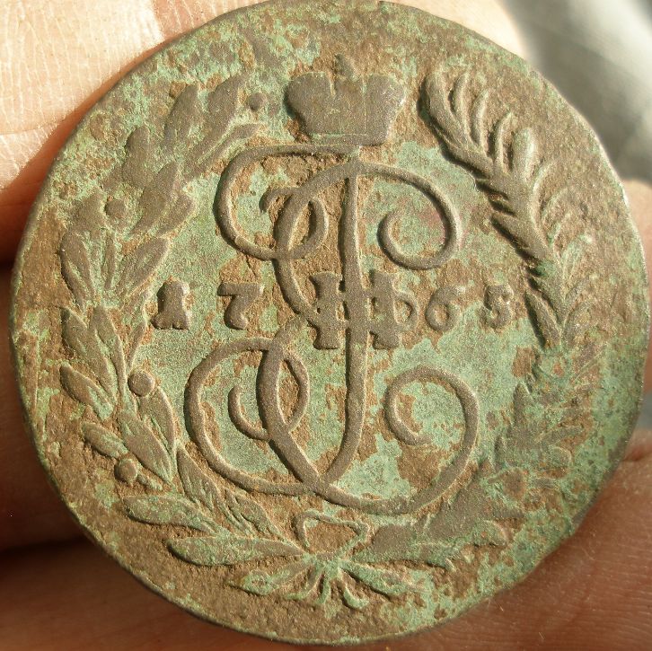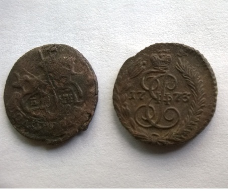 Еще раз здравствуйте, оцените пожалуйста полушку 1773года, дабы не возникало вопросов что это именно полушка, приложил рядом вторую слега подгнившую полушку 1768г, С ув..