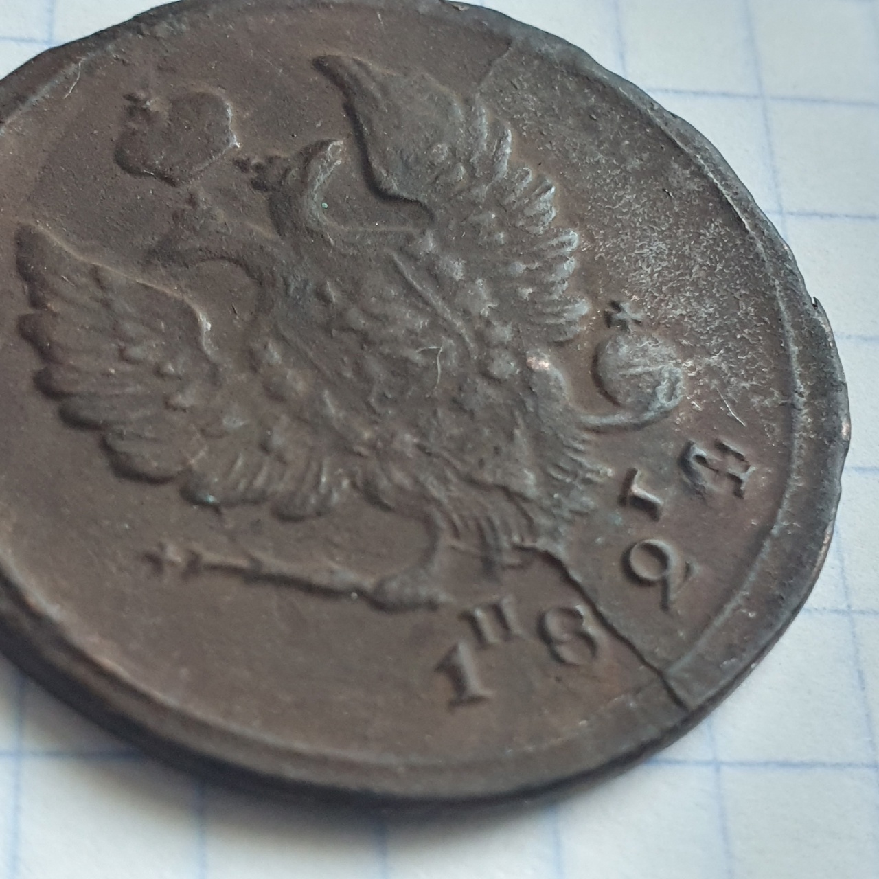 Частичный незначительный раскол штемпеля...весьма распространённый брак даже на современной ходячке, боюсь что сильно цены не прибавит, с уважением!