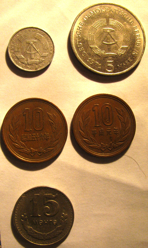 5 марок 1971 (Berlin Haupsadt der BRD) (гурт *5MARK*) 15 менге 1980 (гурт рубчатый) и пара непонятных азиатских монеток (гурт гладкий) 20 копеек 1967 (50 лет советской власти аврора) причем одна монетка с надписью Аврора, а другие без) 15 копеек 1967 (рабочий и колхозница) Есть что-нибудь интересное? Вложенные эскизы изображений |