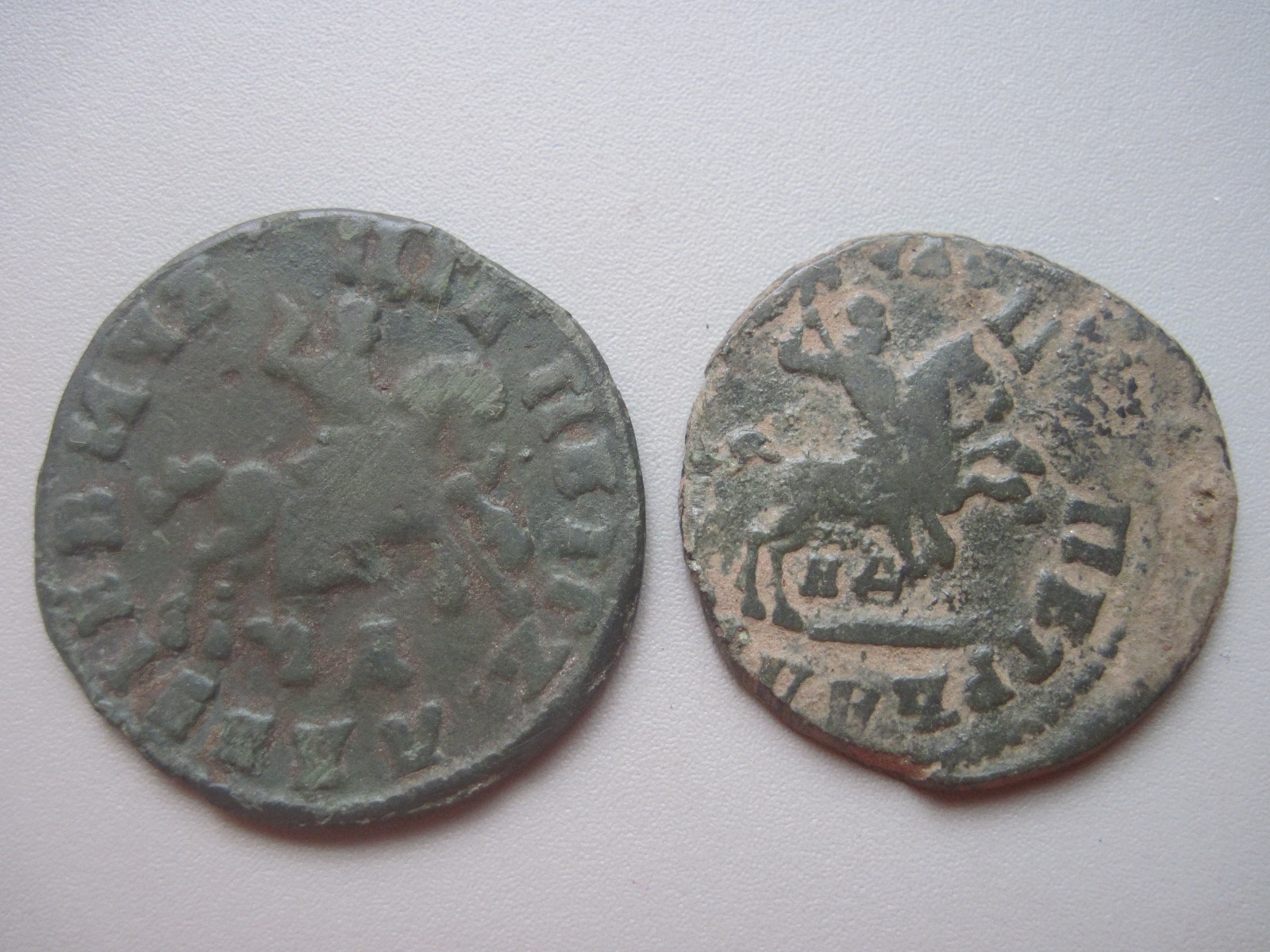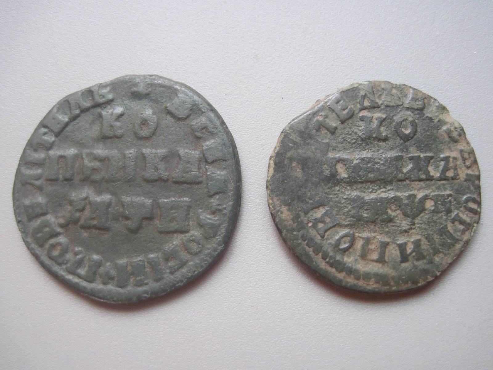 laus: Копейки Петра I, №1. 1708 (?); №2. 1705(?)., с учетом сохрана, думаю в пределах = 500 р./экз..