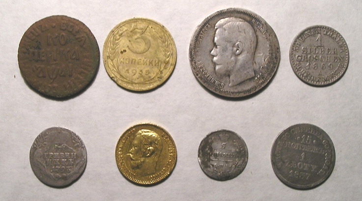 QUOTE(Oldhren @ Apr 21 2011, 02:41) Подскажите, пожалуйста, есть здесь что то стоящее? 1. Копейка 1711 года - 1000 рублей. 2. 3 коп. 1935 года - копейки 3. - 300-500 рублей 4. - не знаю 5. - Гривенник 1793 г. в таком состоянии в районе тысячи рублей. 6. - 5 рублей 1898 г. 4-5 тыс. рублей ( но надо гурт смотреть) 7. - пятачек убитый, в лучшем случае рублей 100. 8. - 15 коп. 1 злотый 1837 г. - рублей 400-500 |