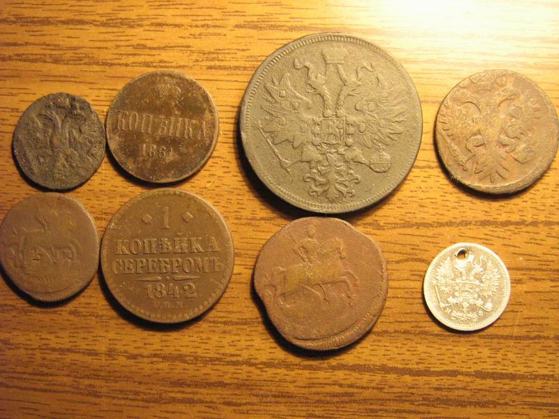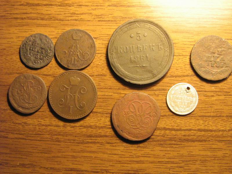 Пожалуйста, кому не лень, дайте оценку этой горсточке мелочи Вот список присутствующих монет: копейка 1861 ЕМ 5 копеек 1861 ЕМ 10 коп 1882 НФ копейка серебром 1842 СПБ полушка 1735 копейка 1770 2(может и 1 копейка непонятно) копейки 1760 копейка серебром 1839 СМ(!) - нет на фото (вымокает в мыле) состояние F. Качество на фото. Особенно по копейке 1839 СМ интересно цену. Посмотрел бы и сам, но каталога нету Большое спасибо всем ответившим. Вложенные эскизы изображений -------------------- Доход вращает эту землю!